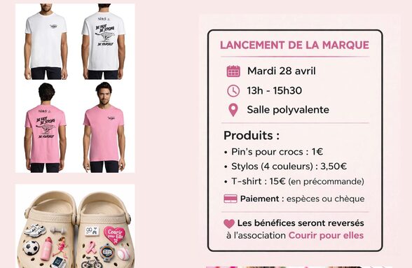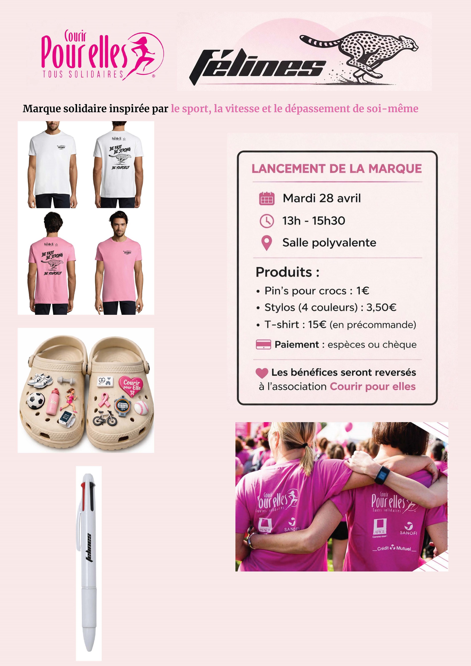 RDV mardi 28 avril 2026 de 13h à 15h30 en salle polyvalente pour découvrir la marque "Félines" créée en partenariat avec l'association Courir pour elles,